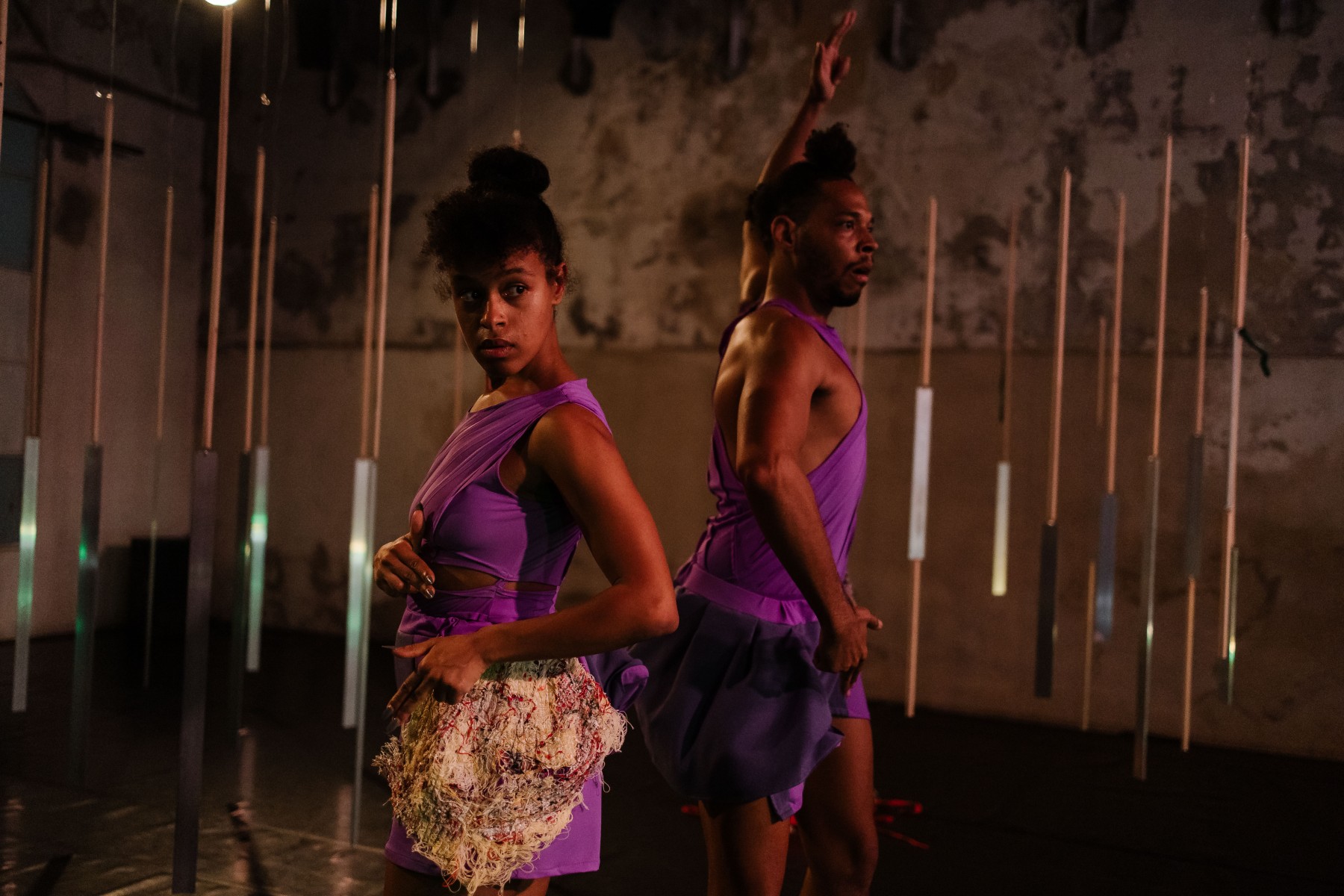In Cadences créoles, dix mille fois dédoublées, Malvin Puerca de Goma and Inés Sybille Vooduness slide into questions contaminated by the Marassa twins from the moving iconography of voodoo. In a gesture that is both a subterranean escape and a light flight, the dancers work within a forgeron imaginary — a metallic, spiralling, sticky, playful, and dangerous poetics. Like a diasporic web of connection, Angolan Kuduro, Jamaican Dancehall, and Dominican Dembow allow them to flirt ironically with horns, guns, and laments. Through the syncretism of this confusion of codes, in which Malvin and Inés both mobilise and generate memory, their union reterritorialises an erotic, protective, and strategic spirituality.